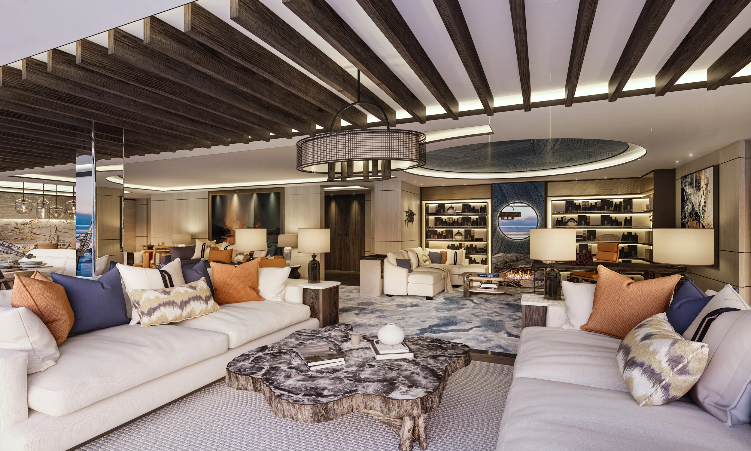The aft deck will form the yacht’s main hub, and become THE place to enjoy a leisurely day at sea. The Beach Club area will open up to the outside deck with a large lap pool and two large spas as well as bars and sumptuous outdoor lounges and seating as its central features. At the stern, the Marina area will house a wide range of watersports equipment and boats to facilitate beach landings, excursions, fishing, diving and snorkelling.
